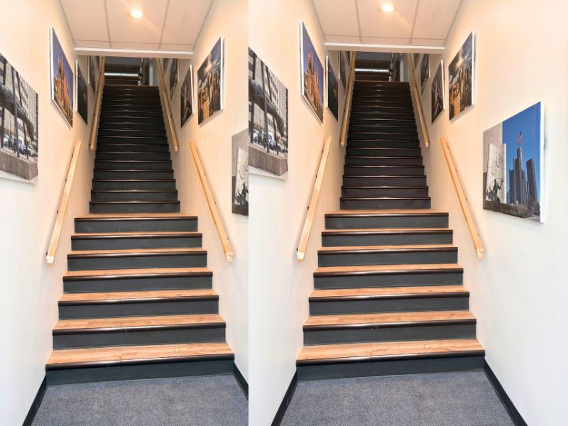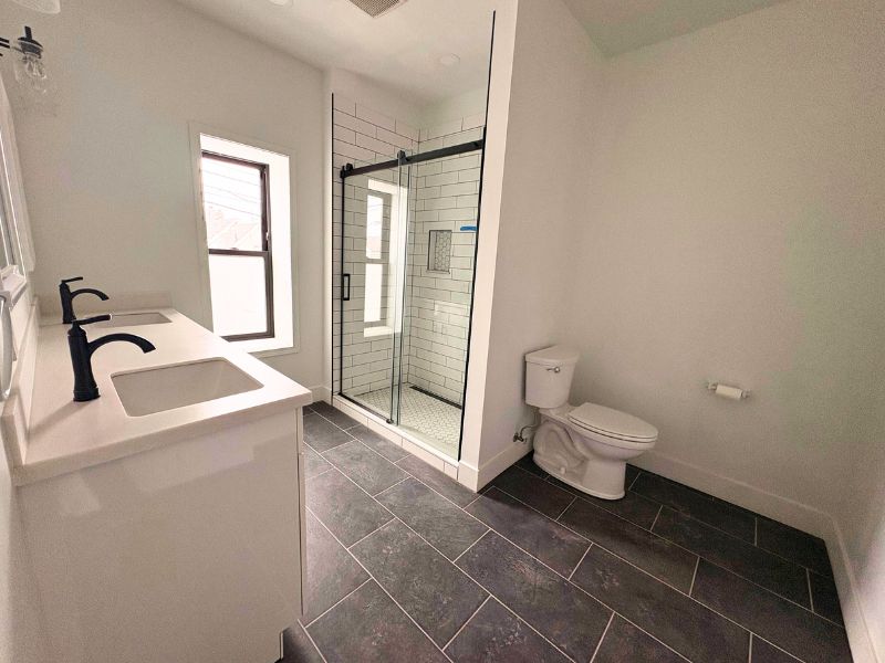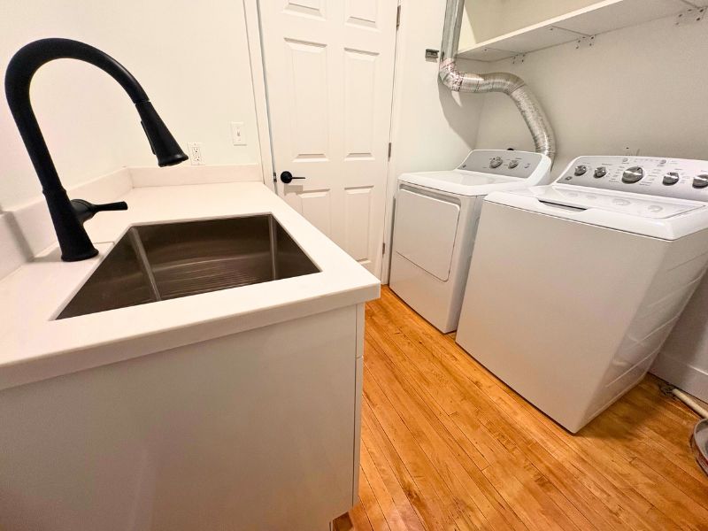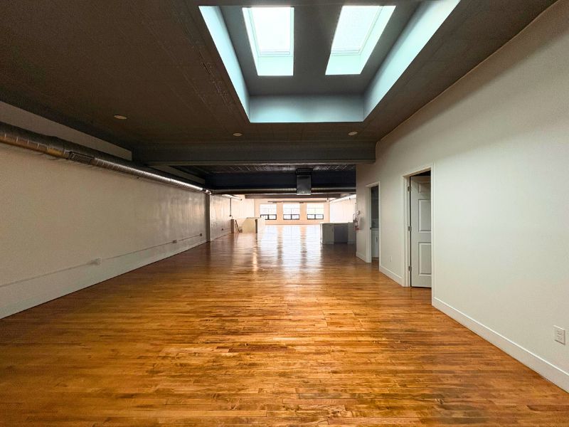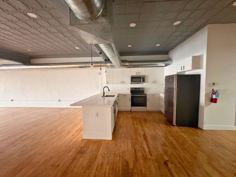 This residential loft sits above street-level commercial space on Joseph Campau Ave in Hamtramck and offers a private entrance with a dedicated stairwell leading directly into the unit. The interior features an open-concept kitchen and living area with clean finishes, modern cabinetry, laminate countertops, and a functional island with a stainless steel sink and gooseneck faucet. Appliances include a stove, refrigerator, microwave, and dishwasher. The space showcases exposed ductwork, recessed lighting, skylights, white brick accents, and vinyl plank flooring throughout. The bedroom offers closet space, a ceiling fan, and natural light. The bathroom includes a walk-in shower with built-in shelving and tiled flooring. An in-unit washer and dryer add everyday convenience. A private walk-out deck with a sliding glass door and black metal railing provides outdoor space.